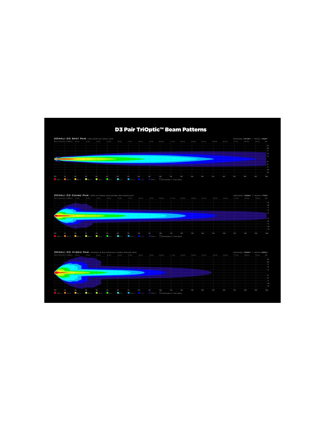 Les nouveaux feux à DEL D3 s'appuient sur une décennie d'innovation DENALI pour offrir l'éclairage de 36 watts le plus performant sur le marché. Le feu D3 dispose de du système de faisceau TriOptic™ signature qui comprend un spot et une lentille de conduite hybride avec chaque pod. Contrairement aux feux TriOptic™ précédents, le faisceau de conduite hybride D3 est conforme aux normes ECE et SAE pour offrir un faisceau impressionnant et légal en Amérique du Nord et dans les pays de l'Union européenne. Mais qu'en est-il si vous n'êtes pas concerné par la précision de la loi sur les routes et que vous voulez simplement un faisceau hors route ? Nous vous couvrons également ! La lentille du spot D3 a été conçue pour une distance maximale du faisceau de plus de 1900 pieds à 1 lux (par paire). Aucun autre clairage de 36 watts ne s'en approche. Le faisceau ponctuel est si impressionnant qu'il surpasse les lumières des concurrents de premier plan qui font deux fois sa taille.