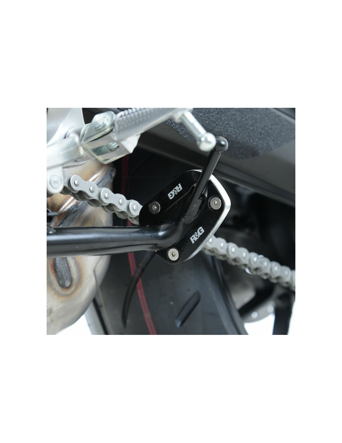 Les patins de béquille R&G Racing se vissent sur votre béquille d’origine et doublent la surface d’appui, pour éviter l’enfoncement dans le sol. Malgré sa taille plus importante, la garde au sol et la ligne de chaine ne sont pas affectées dans des conditions normales de conduite.