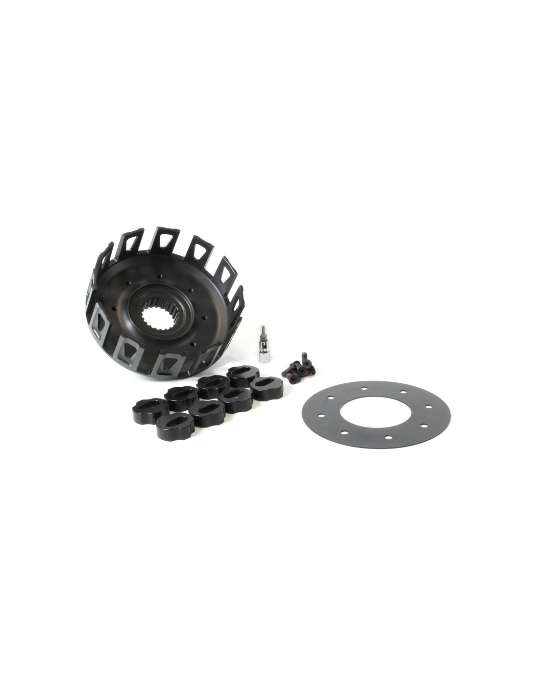The special added Teflon coating seals the coating to create a near frictionless surface for the clutch plate tabs to glide upon. All our clutch baskets comes with pre-applied thread locker fasteners and an inbus tool.