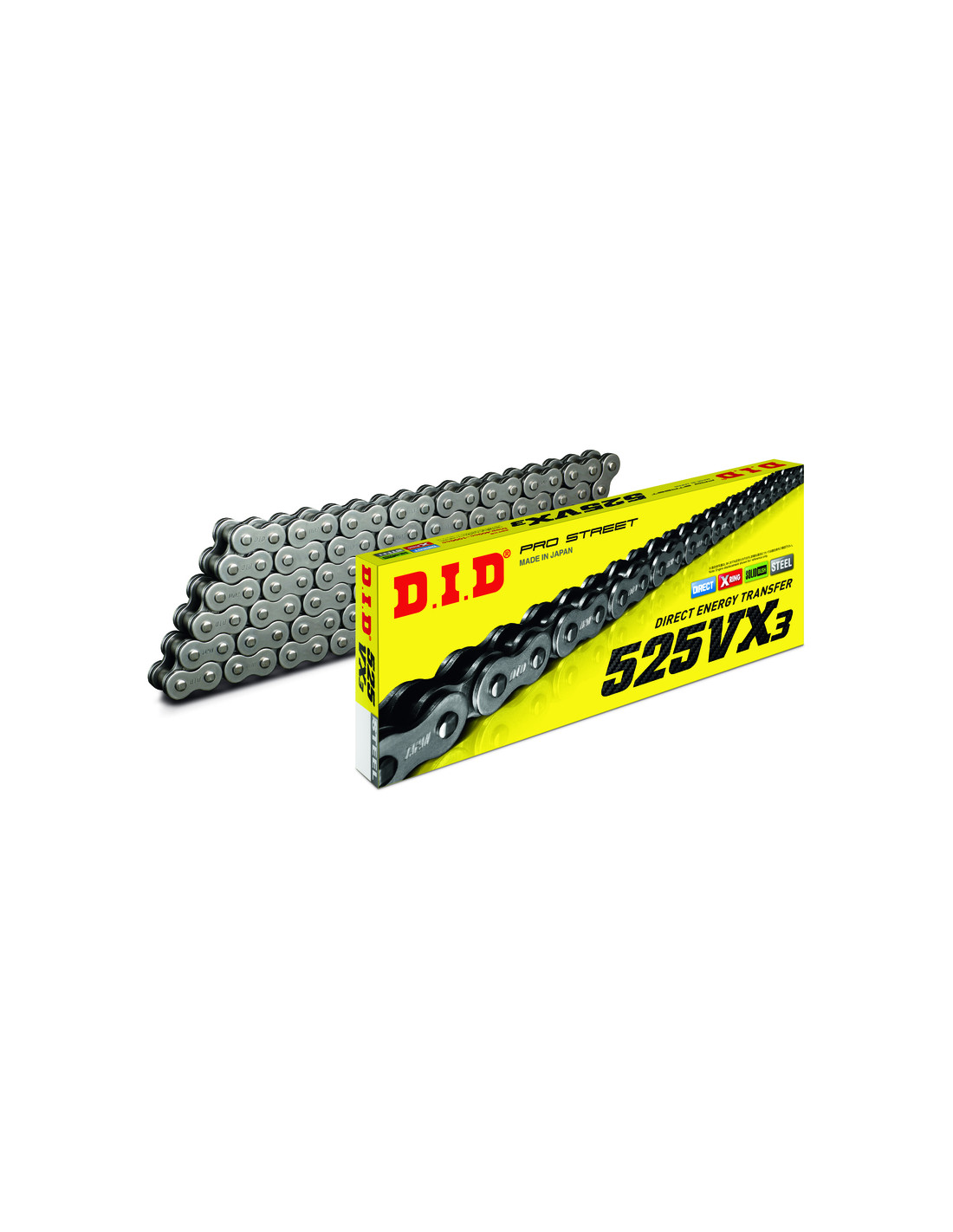 La série des chaînes VX D.I.D inclus les 428VX, 520VX3, 525VX3, et 530VX3 proposées pour de nombreuses applications street et off-road, de 350cc à 1100cc.
