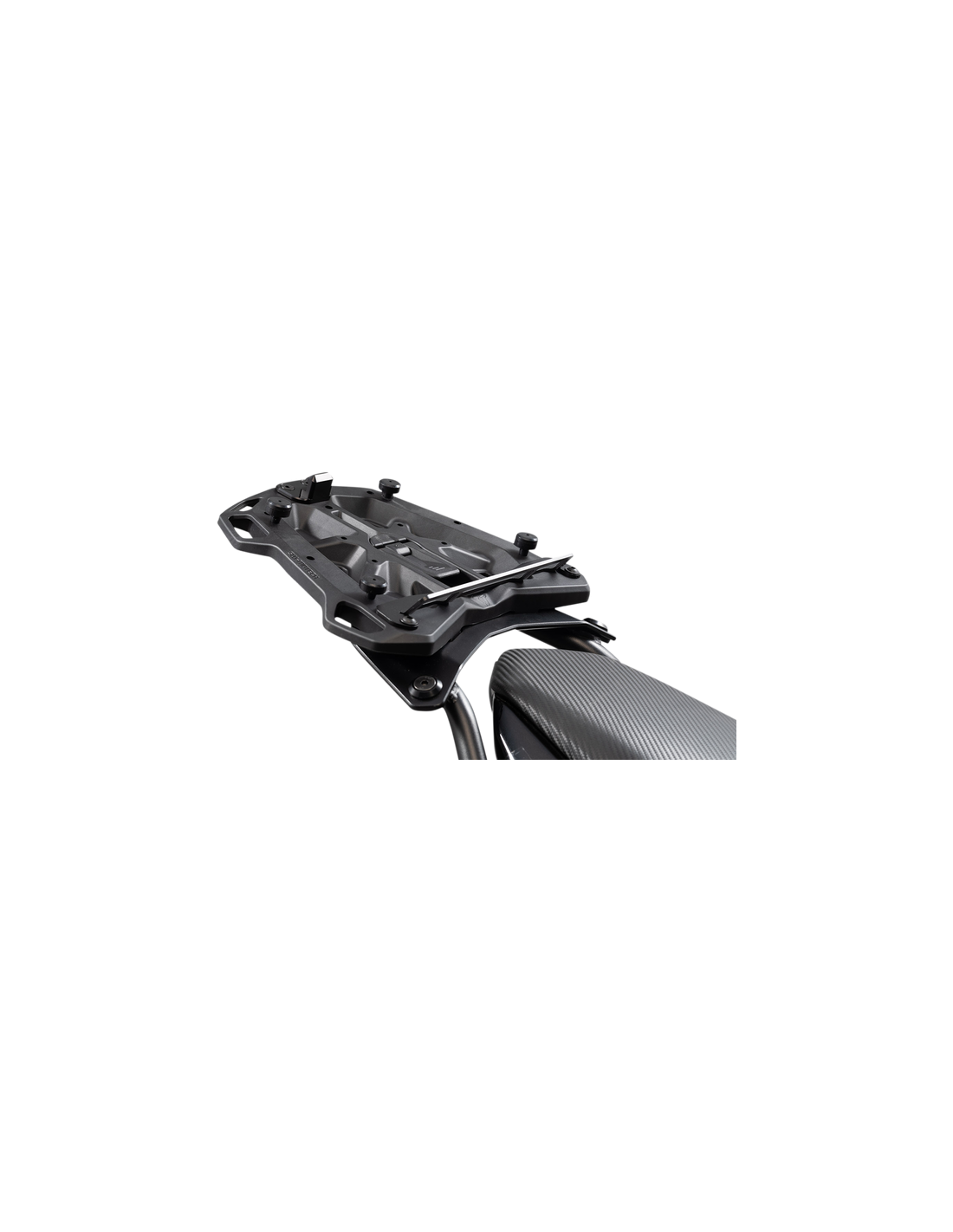 Ce support adaptateur peut être monté sur le porte-paquet STREET-RACK en toute simplicité Aucun outil nécessaire !, Le support adaptateur est simplement glissé sur le porte-paquet et verrouillé fermement à l’aide d’un verrou de blocage., Après usage, le support adaptateur peut être retiré en quelques secondes et seul le porte-paquet reste sur la moto., Le support adaptateur séduit aussi grâce à sa large surface de contact plate et ses six grands œillets de fixation.