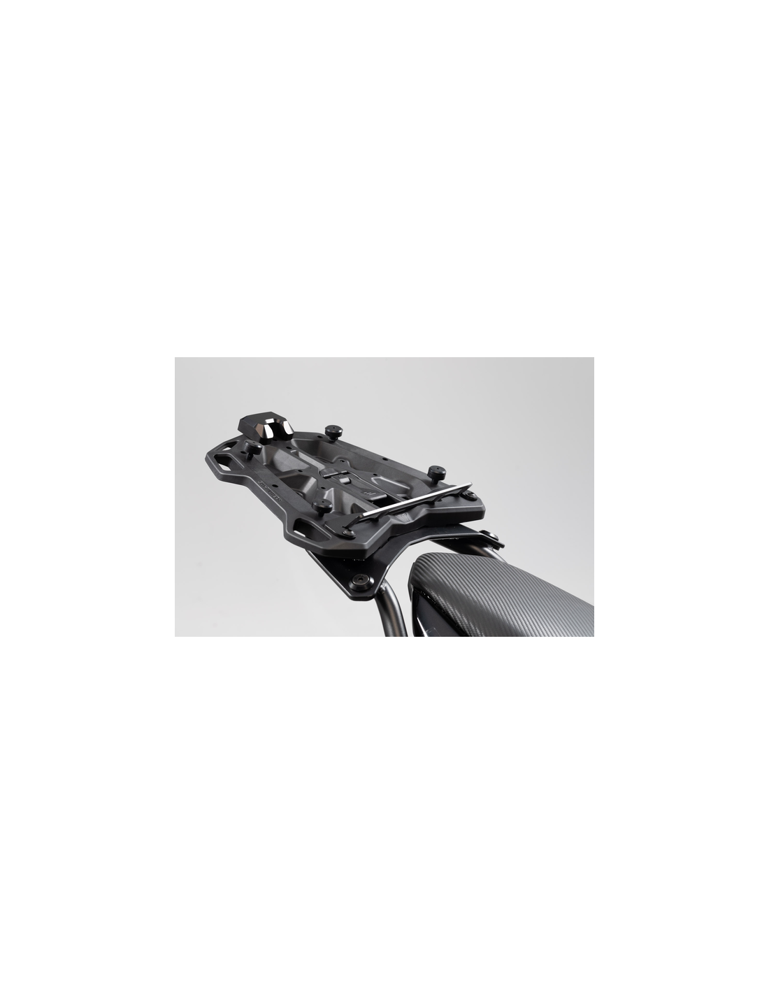 Ce support adaptateur peut être monté sur le porte-paquet STREET-RACK en toute simplicité Aucun outil nécessaire !, Le support adaptateur est simplement glissé sur le porte-paquet et verrouillé fermement à l’aide d’un verrou de blocage., Après usage, le support adaptateur peut être retiré en quelques secondes et seul le porte-paquet reste sur la moto., Le support adaptateur séduit aussi grâce à sa large surface de contact plate et ses six grands œillets de fixation.