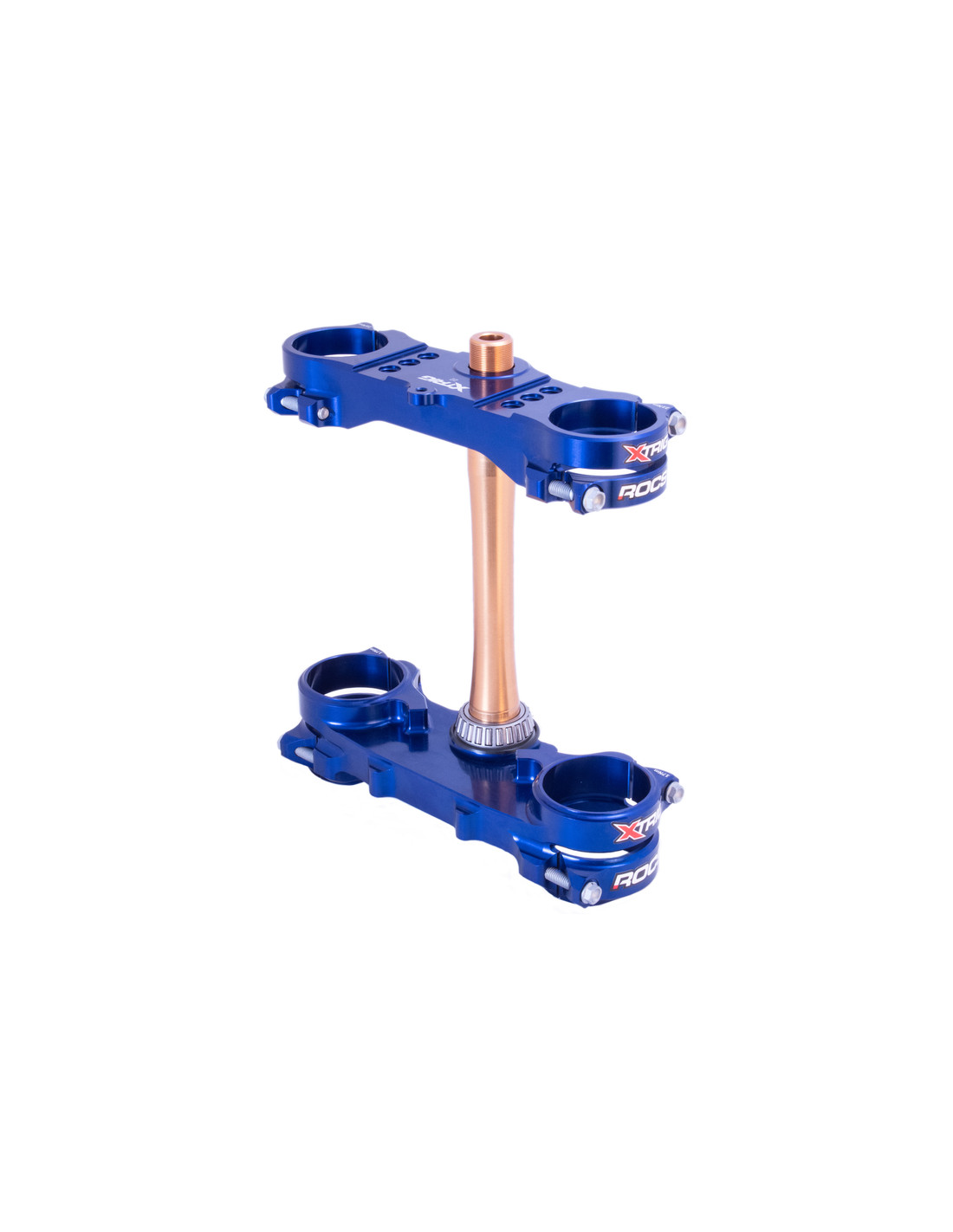Le ROCS , a été l'un des développements les plus spectaculaires et les plus élaborés de XTRIG au cours des dernières années. Les avantages de ce système par rapport à un té conventionnel sont la moindre déformation des montants de la fourche dans la zone de serrage, ce qui a un effet notable sur la réponse de la fourche, mais aussi la conception avec les deux colliers opposés, qui assurent une plus grande sécurité contre la torsion de la fourche grâce à l'effet d'auto-verrouillage. Un autre avantage réside dans le fait que les vis de serrage ne s'influencent pas l'une l'autre, ce qui permet d'obtenir un couple de serrage plus précis. Comme il n'y a pas de matériau entre les vis de serrage, les colliers triples ROCS ont également un poids inférieur.