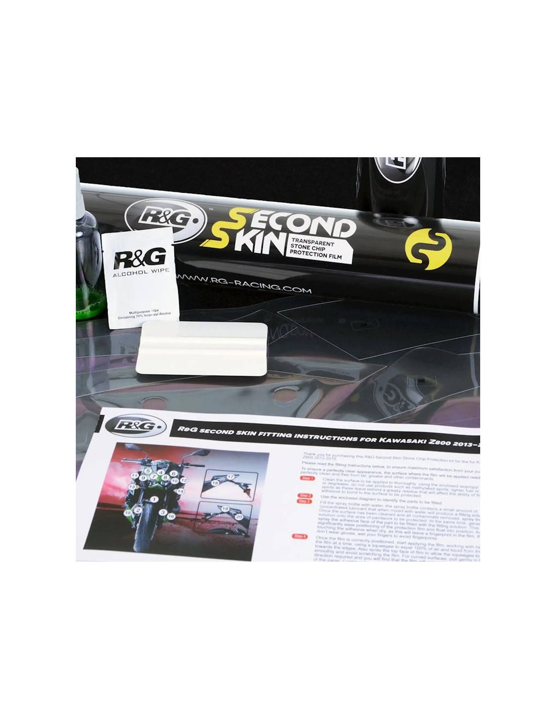 Les kit standards incluent les films protecteurs prédécoupés destinés au garde boue avant, à la fourche, aux carénages avant ainsi qu’au dosseret de selle.