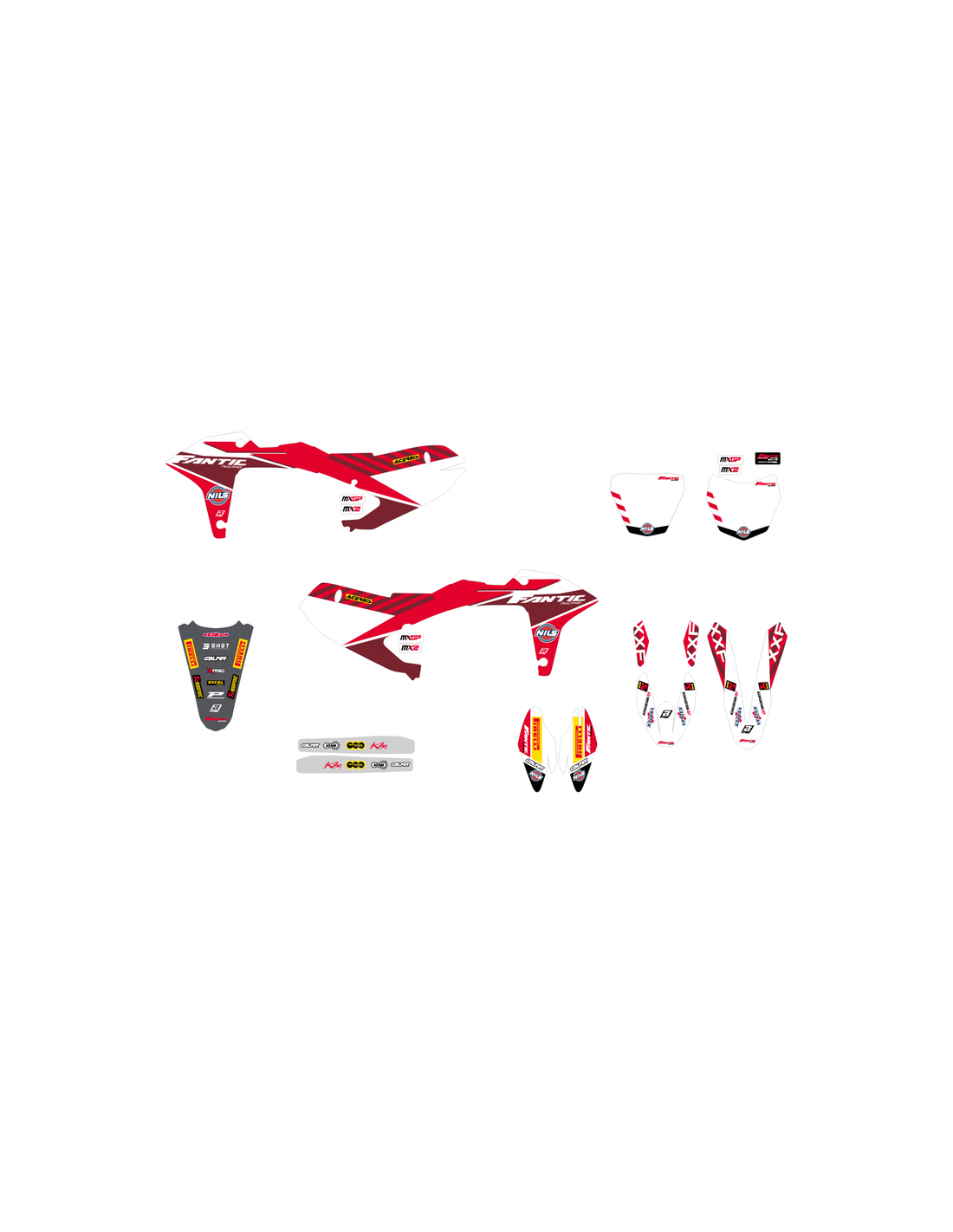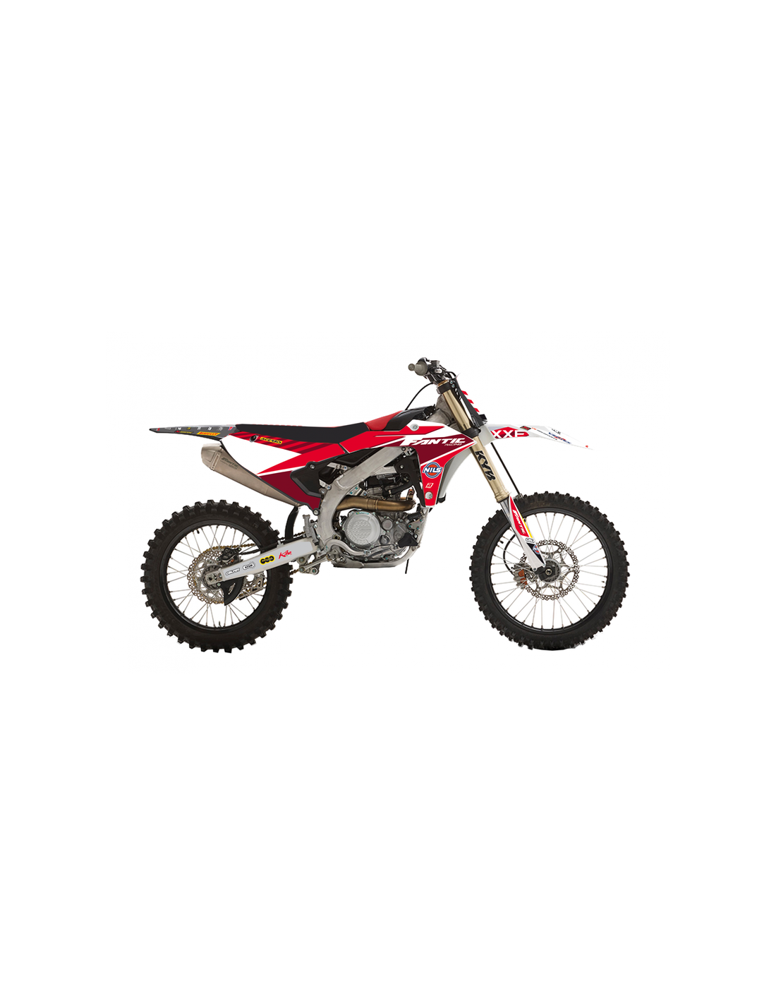 - Kit déco complet : ouïes de radiateur, housse de selle, garde-boue avant/arrière, protections de fourche et stickers de bras oscillant
